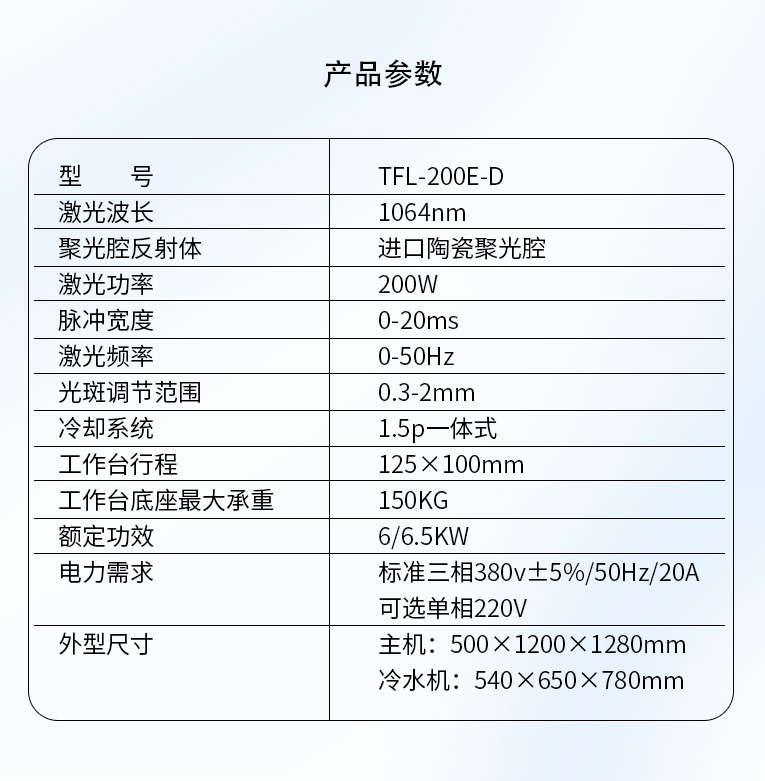 出口型模具激光焊機是通發激光公司專門為出口國外客戶使用而設計的系列機型TFL-200E-D,配置激光頭電動升降,同時配置操縱桿無極調速控制XY橫向和縱向電動移動。適用于各類精密注塑模具、壓鑄模具等模具激光修補焊接;同時也適合鑄件沙孔激光修補、模具崩缺激光修復、過切加工等的激光修補;各類金屬結構件、金銀首飾的激光焊接加工。